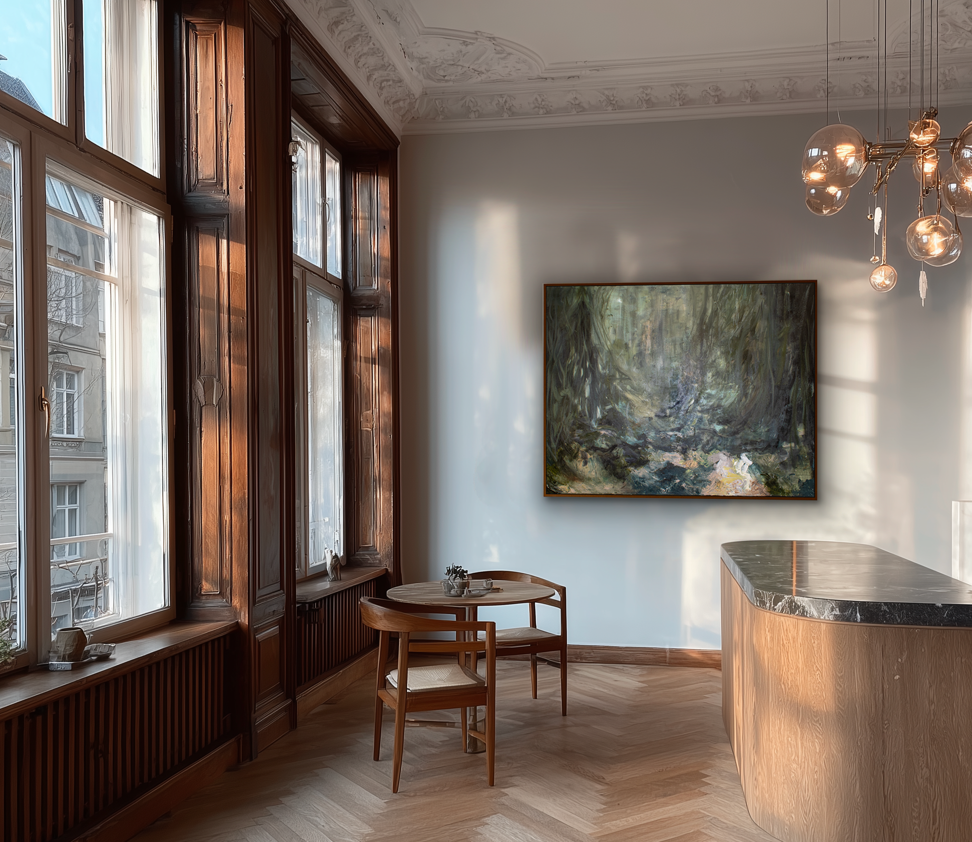 Morning Forest is a contemplative work that brings depth, calm, and a sense of mystery—perfect for interiors seeking a connection to nature and the quiet beyond the everyday.